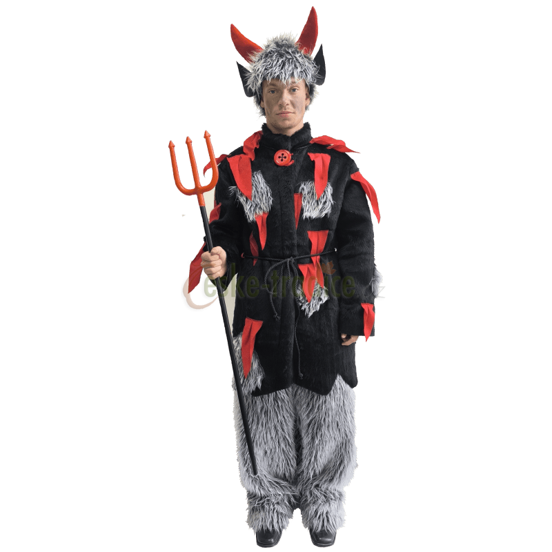 Čertovský kožich s plameny, šedými záplatami a ocasem. Opasek z tlusté oděvní šňůry.